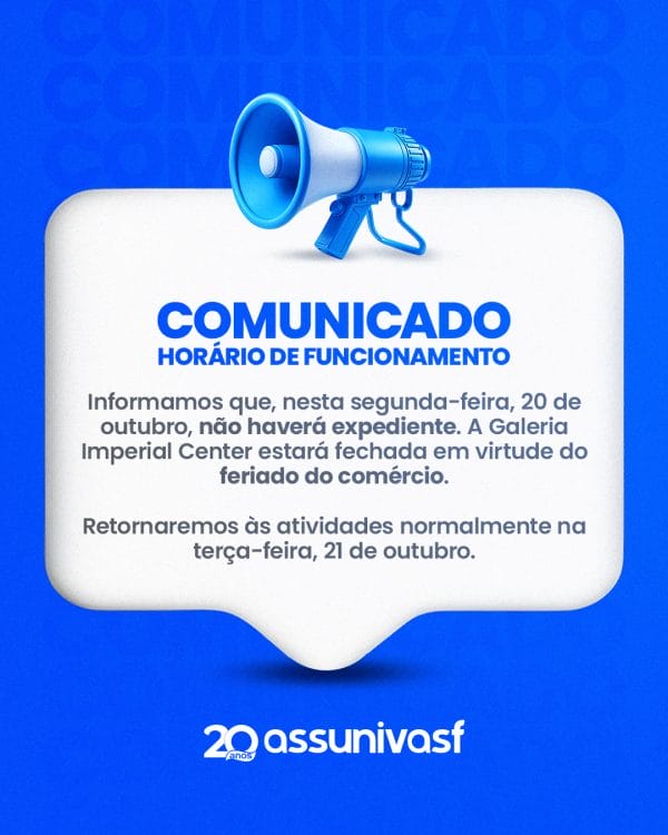 Informamos que, nesta segunda-feira, 20 de outubro, não haverá expediente. A Galeria Imperial Center estará fechada em virtude do feriado do comércio.