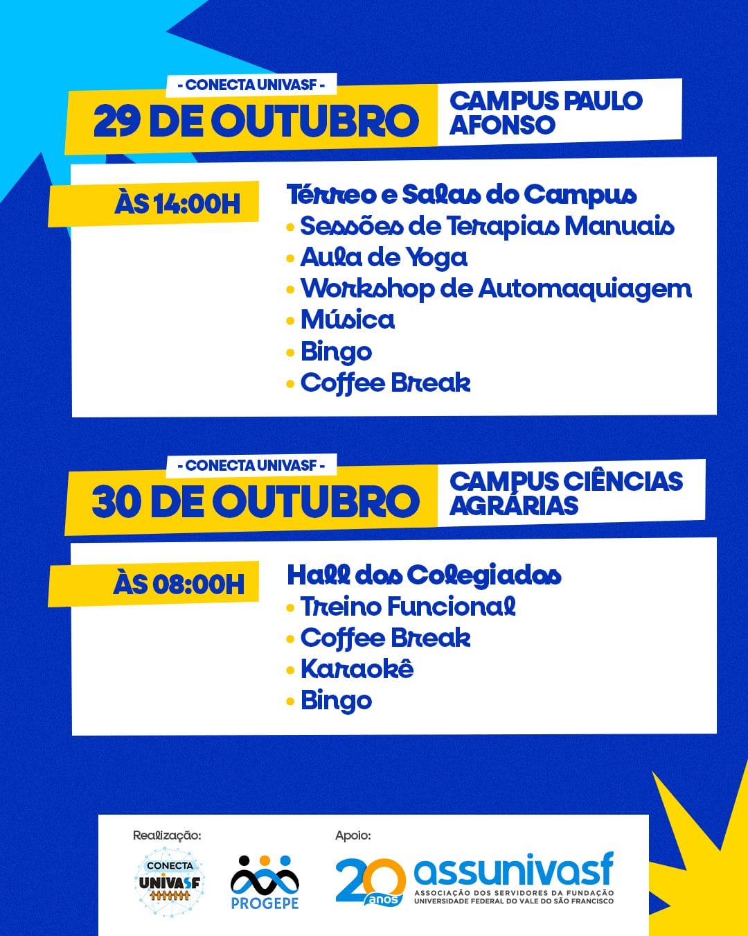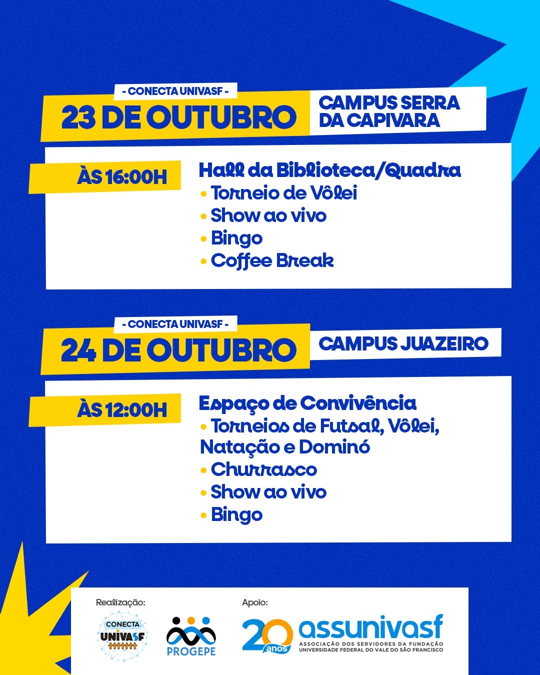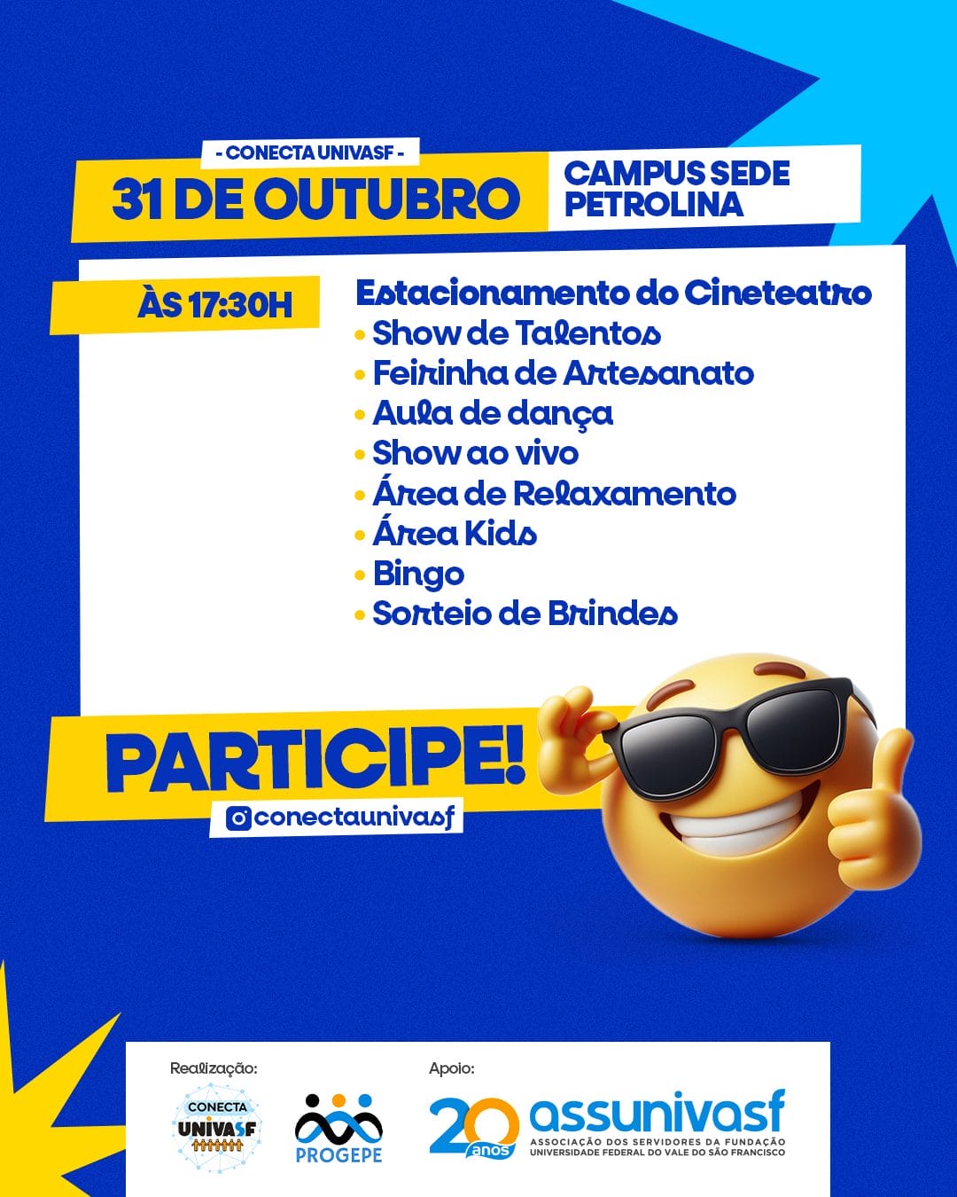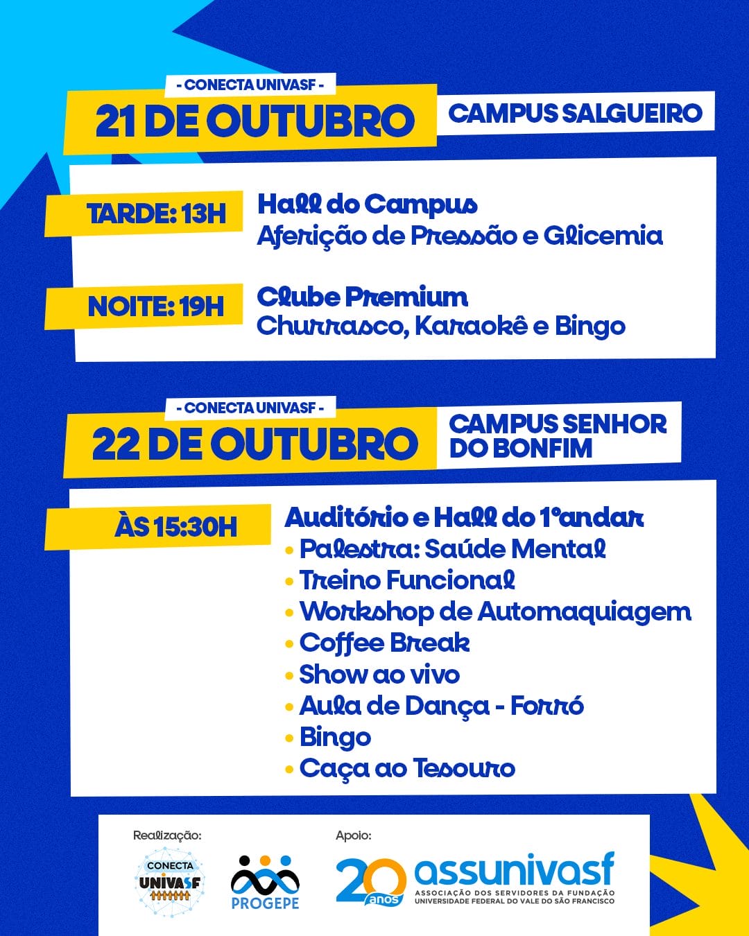 A partir de amanhã (21/10) daremos início à programação do Conecta Univasf, evento que será realizado em todos os sete campi da Univasf, com o apoio da ASSUNIVASF, tendo a finalidade de conectar, valorizar e celebrar quem faz a nossa universidade acontecer todos os dias, os servidores e servidoras da Univasf. 💙💛